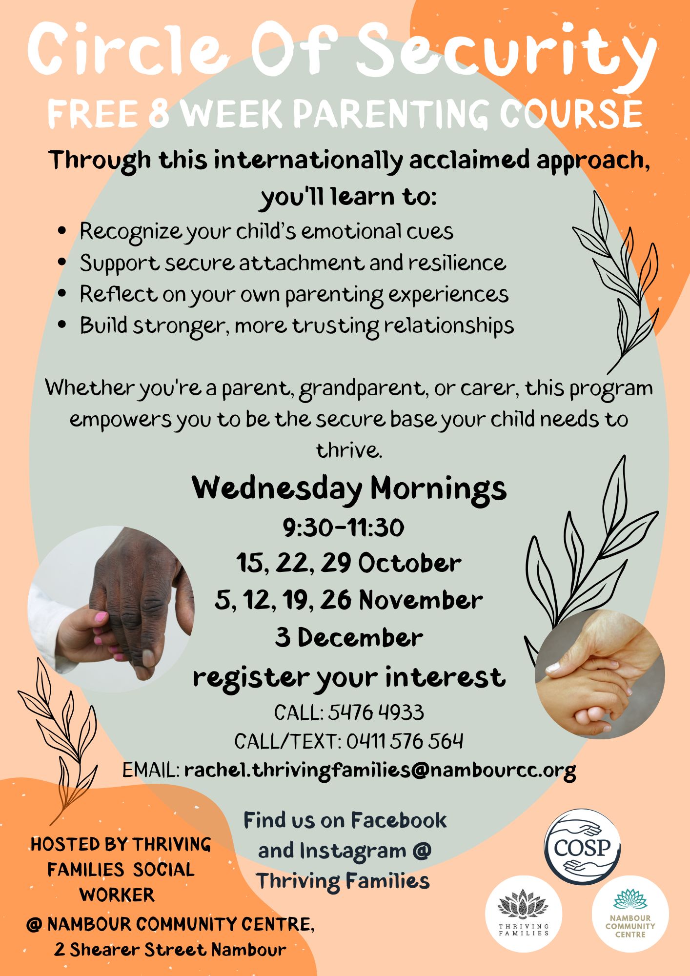 Circle of Security COS is an Internationally known parenting program that teaches parents the importance of identifying their child’s needs and how to support them in these needs. It is a program run once a week for 2 hours over eight weeks